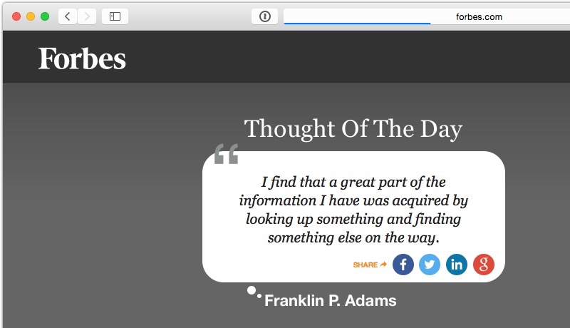 Anyone who has ever visited blog posts on the Forbes website has properly been irritated from time-to-time by its practice of displaying a "Thought of the Day" for a few seconds before it passes you onto the article that you actually wish to read. We all understand that Forbes has to make money like any other web publisher, but the "thought" (which is usually accompanied by an ad) somehow grates because it gets in the way of often genuinely-interesting content. What's worse, however, is that it turns out that annoyance might be the least of your troubles with Forbes's "Thought of the Day" interstitial. It has been revealed that for a while in November last year, web visitors were also running the risk of having malware infecting their computer because of it.