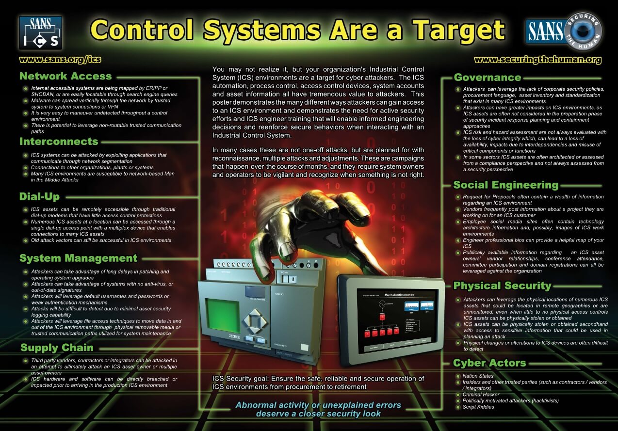 The poster above from the SANS Institute characterizes common risks and exploitable weaknesses to consider. Examples of human factors influencing the size of your attack surface and directly related to cyber and business risk include a lack of ICS security knowledge, resistance to change (or choosing to bypass security rules/policies to avert disruption), ICS systems connected directly to the Internet (for maintenance, software updates or just unaware), susceptibility to social engineering, unsupervised insider privilege, opportunities for operator error or negligence, awareness training for email security, worker absence (such as due to illness, quitting, death, retirement), and a lack of ICS security policies or training.