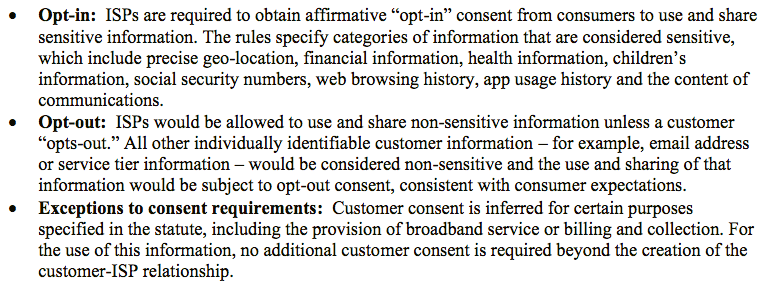 According to a fact sheet (PDF) issued by the FCC, consumers will have a choice as to what types of data ISPs can collect about them under the new rules. For instance, ISPs will need to obtain users' "opt-in consent" for certain pieces of sensitive information like precise geo-location data, Social Security Numbers, app usage and web browsing histories, and communication content. Users will also have the ability to opt-out of agreements under which third-parties can share non-sensitive information like their e-mail addresses. Otherwise, ISPs can continue to share that information with marketing agencies.