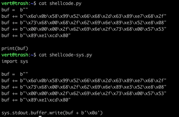 However, if you look at the two pieces of shellcode, you’ll notice that the Python 2 output is 1 byte longer. Our Python 3 output does not contain the 0x0a in position 0x2B.